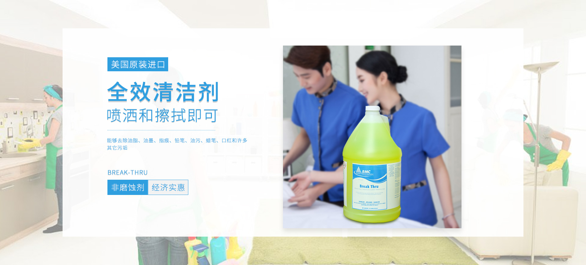 新朗環境自2015年起與美國具百年歷史的跨國企業RMC(Rochester Midland Corporation)合作, 進口 RMC用于機械制造、交通運輸、航天航空、石油化工、食品禽肉乳制品加工等工業生產制造行業的專業清洗、滅菌系列產品,以及酒店、CBD大廈、學校(包括幼稚園)、醫療機構、百貨商場、養殖業、餐飲業等商用行業清潔、消毒系列產品,還有專用于各個行業單位“廁所革命”的公共衛生間根源除味第5代SANOR?衛生間自動滴管系統、第6代百屋潔SIOGIENIUS?電子控制衛生間自動滴注系統等系列產品項目。